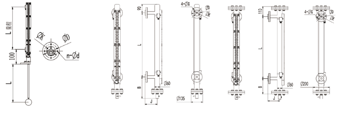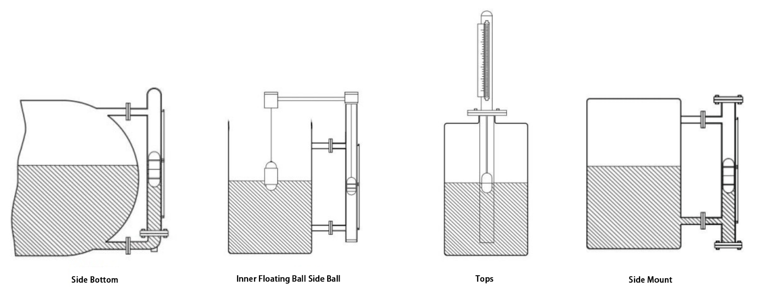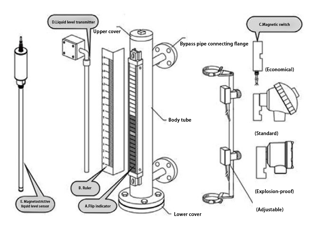 Los indicadores de la serie LF800 se instalan con tubo de derivación, ya sea superior o lateral. El cuerpo principal está equipado con una pantalla magnética, un interruptor de nivel y un transmisor de nivel. La unidad magnética se coloca dentro del flotador o se conecta a él mediante una varilla. A medida que el flotador se mueve con el nivel del líquido, gira las aletas magnéticas de la pantalla. El interruptor de nivel se activa en los puntos de nivel correspondientes, mientras que el sensor de nivel emite una señal de resistencia influenciada por el campo magnético del flotador. Esta señal de resistencia es convertida por un transmisor en una señal de corriente de 4-20 mA.